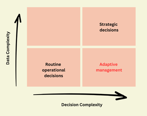 In this era of big data, it is easy to get analysis paralysis. What level of evidence is “good enough” to make a decision with? The answer is – it depends. Adaptive management is the practice of using the best available evidence to make decisions amid ongoing uncertainty. It tends to rely on less complex data to make complex decisions (see diagram below). Do not confuse adaptive management with making ad hoc decisions. Doing adaptive management right requires organizations to create data systems that deliver information quickly. Organizations must also invest in creating a culture of reflection and continuous learning.