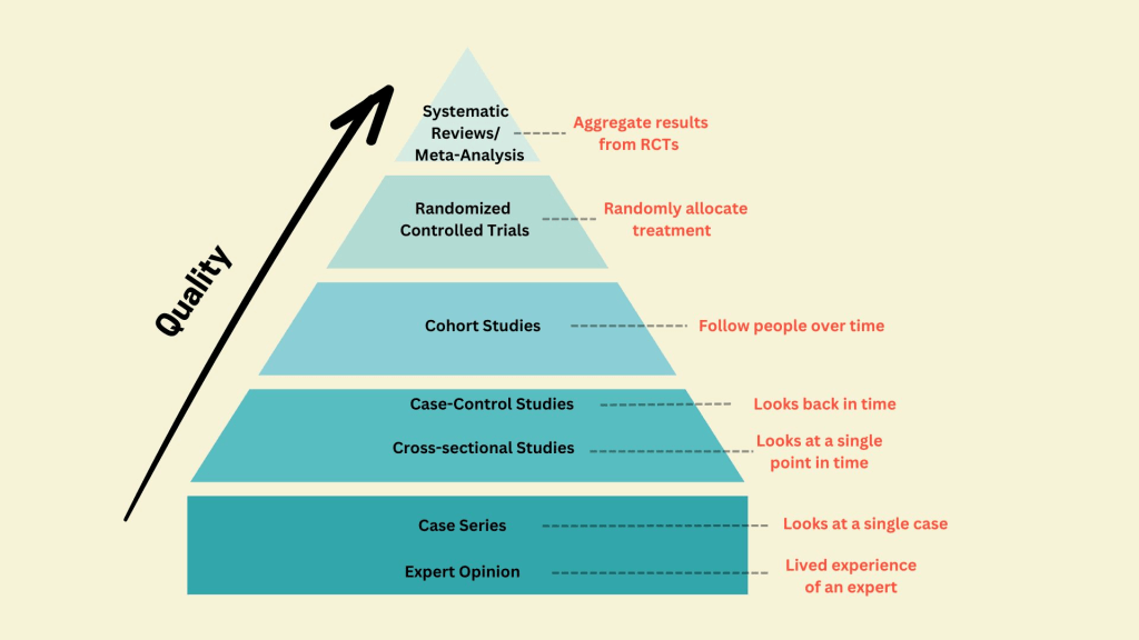 Many see this hierarchy as too rigid and not able capture the complexity of how decisions are made in the real-world. This has led to a movement towards evidence-based practice. This approach combines the “best” available evidence, expert opinion and the preference of those affected by a decision (such as patients) to inform a decision. A recent scoping review found that using evidence-based practices improved the tripple aim of heathcare – improving patient outcomes and experience while reducing cost [1].