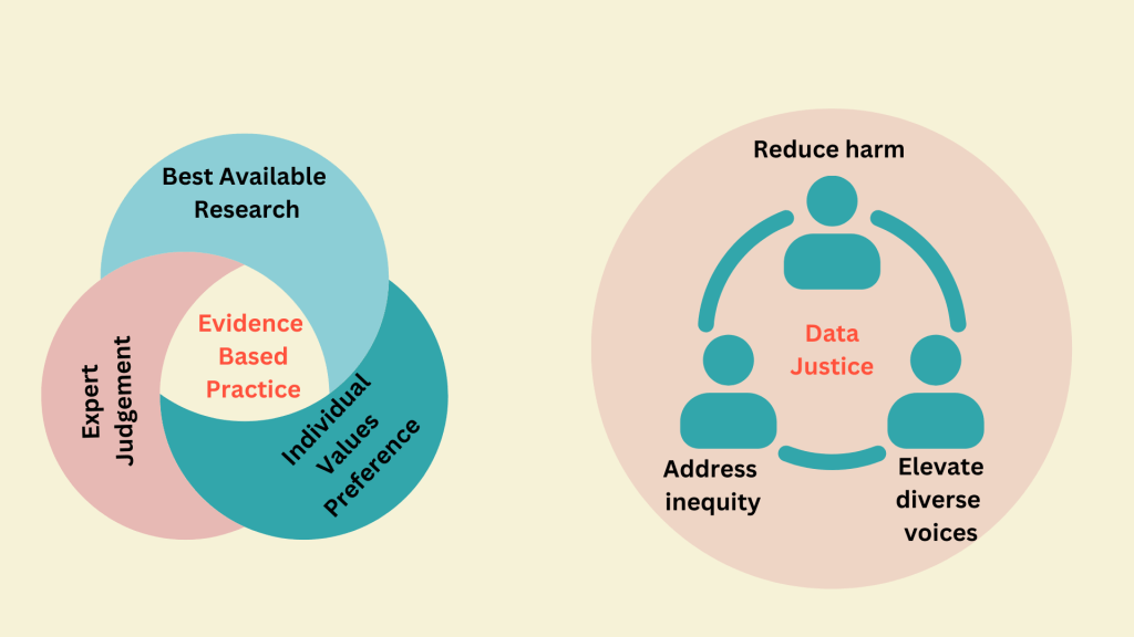 Evidence-based decisions should balance the desire for scientific rigor with the values and preferences of the people who will be affected by the decision. Putting data justice into practice requires shifting power and reassessing how we value certain types of evidence.